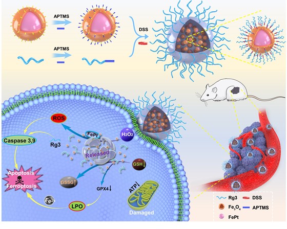 最近团队在突破化学动力学疗法(CDT)临床应用的关键技术瓶颈“用药安全性和药物有效利用率”以及实施多模成像、靶向肿瘤微环境(TME)、同步激活铁死亡-凋亡双重机制抑制肿瘤方面又取得创新成果。研究成果以“Dynamic ginsenoside-sheltered nanocatalysts for safe ferroptosis-apoptosis combined therapy”为题,在Acta Biomaterialia上在线发表,//doi.org/10.1016/j.actbio.2022.08.026。(*CDT激活细胞凋亡是一种潜在的抗癌策略,但其具有严重的毒副作用以及治疗效率低等问题,严重制约其临床医学转化。)